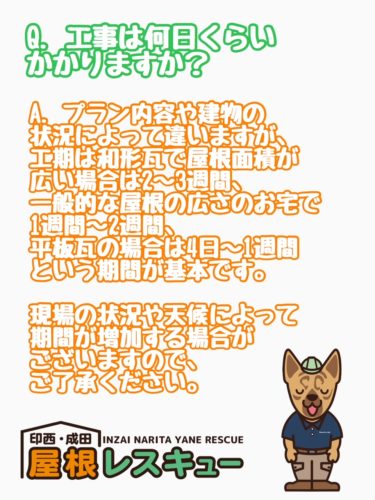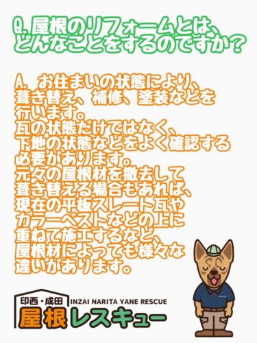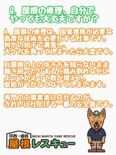 #屋根工事#屋根修理#雨漏り修理#台風被害#千葉県#印西市#成田市#富里市#我孫子市#白井市#鎌ヶ谷市#柏市#佐倉市#八千代市#印旛郡栄町#山武市#茨城県#龍ヶ崎市#守谷市#牛久市 #カバー工法#雨樋修理#屋根補修#葺き替え工事#屋根塗装#外壁塗装#屋根リフォーム#スレート屋根#葺き替え工事 #屋根の困ったを解決するレスキュー犬コマちゃん🐕