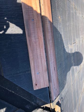 コロニアルの棟板金が飛んでしまっていました。 ご予算の都合で、飛んでしまった部分のみ補修してほしいとのご要望でしたので、 部分的に棟板金と下地の材木を交換をご提案いたしました。 |