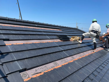 屋根材の上から穴を開けないよう、既存の瓦をはがしています。