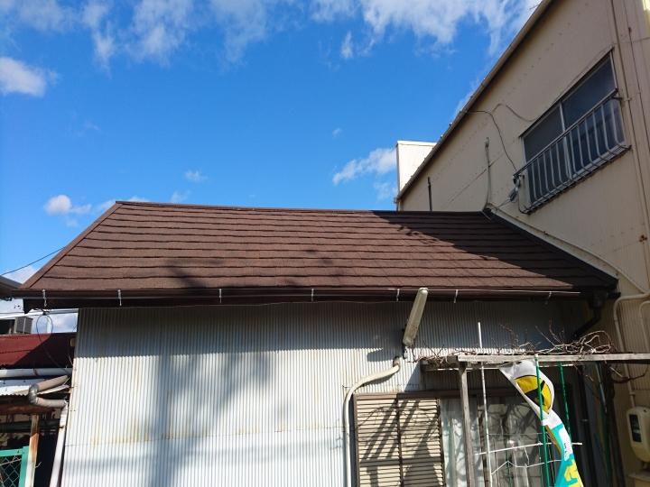 施工完了後の建物(屋根)全景です。雨樋の取り替えもしました。