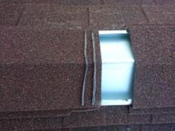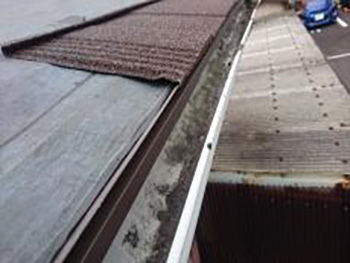 雨漏りの原因になっていた箇所です。棟板金と屋根材の間に隙間がなく、雨の逃げ道がなくなっています。