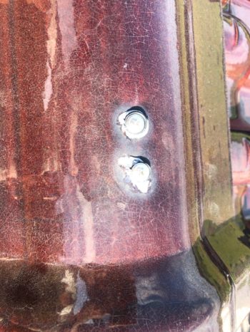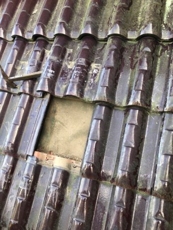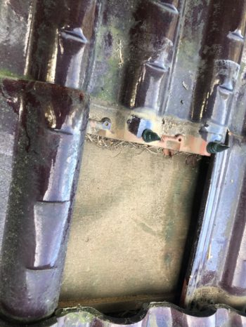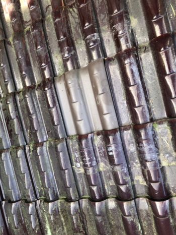 瓦の割れとひび割れが コーキングで補修されていました。 軒先の割れている部分に板金が差してありました